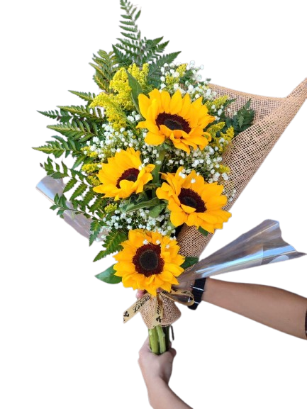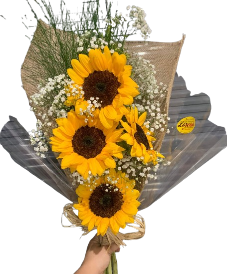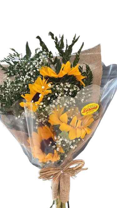 Arranjo rústico, composto por 04 Girassóis, tango, gipsofila, embalado com tela, e laço de rafia.