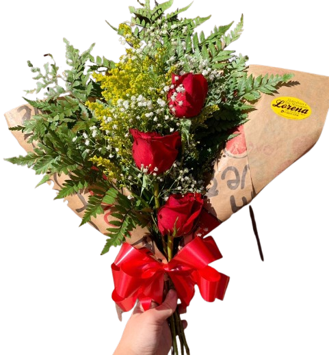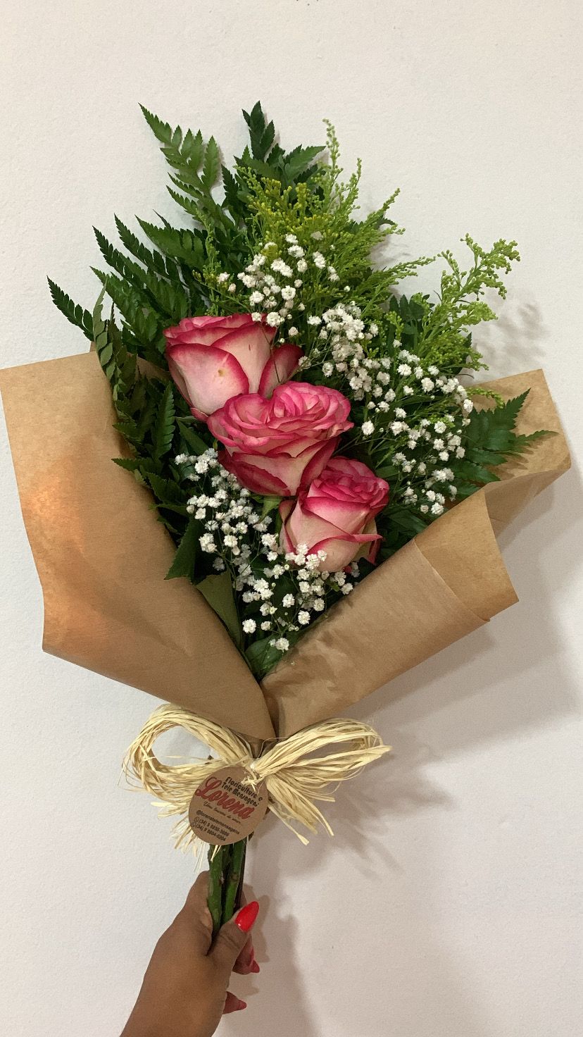Lindo arranjo de 03 rosas, folhagens, tango, gipsofila, finalizado em papael hraft e fita de cetim.