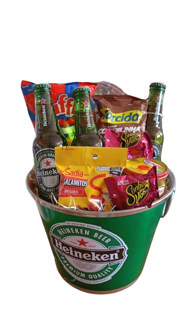 Lindo Balde da heineken composto por uma Petisqueira de Amendoim sortidos, 3 Heineken, 1 Seleção ,1 Batata huffs ,1 Azeitona, sala-mitos e Sonho de Valsa.