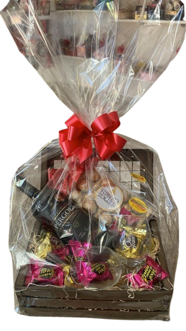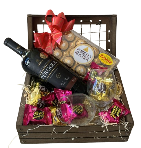Lindo baú , decoarado composto por Ferrero Rocher 12 Unidades , 06 bombons Ouro Branco, 06 Bombons Sonho de Valsa, vinho e 02 taças, finalizado em embalagem celofane transparente e laços. A marca do vinho pode variar.