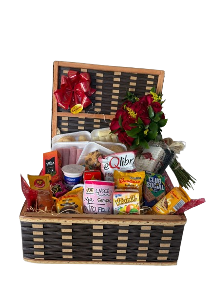 Contém um lindo Baú decorado, com 1 bandeja pão de queijo, 1 bandeja de broa, 1 bandeja de bolo, 1 bandeja de presunto, 1 bandeja mussarela, 1 biscoitinho doce, 1 biscoito salgado, rosca, 1 Toddynho, 1 suco, Cappuccino, 1 danone, 1 torrada, 1 vitamina, 3 bolinhos Bauducco, acompanha 1 caneca e 1 buquê de 12 rosas rústico (cor a escolha do cliente – vermelho, rosa e amarelo).