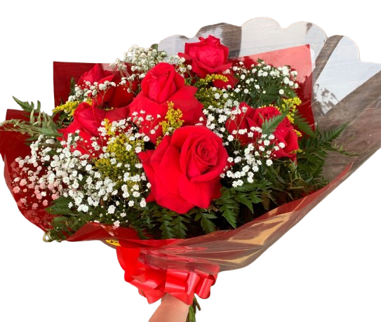 Lindo Buquê composto por 06 lindas rosas colombianas importadas, folhagens, e gipsofila, em uma linda embalagem finalizado com laço de fita!
