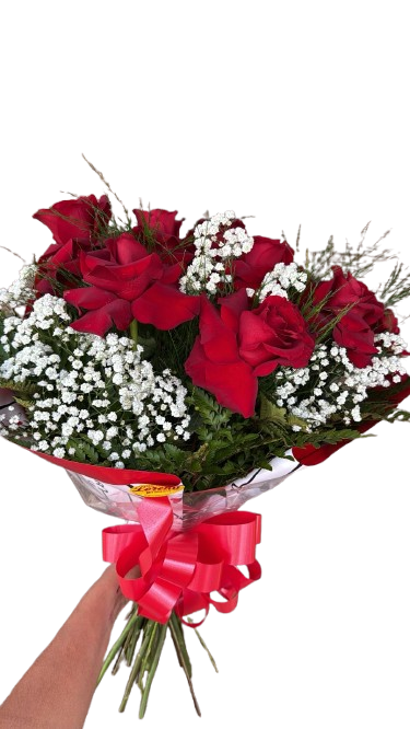 Buque de Rosas Colombianas , composto por 12 rosas importadas , verde, e gipsofila , embalado em celofane transparente , finalizado com laço.
