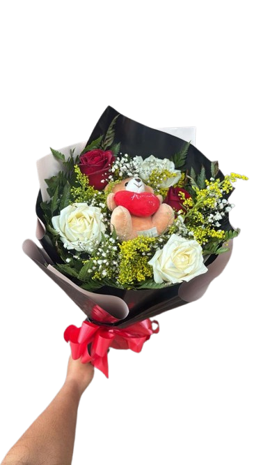 Lindo buquê composto por Tango, folhagens e gipsofila, 6 rosas e um chaveiro PP finalizado com papel coreano e laço de fita.