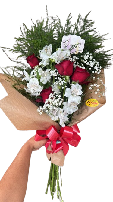 Composto por 04 Rosas, 04 Galhos de Astromélias, Aspargos e Gipsofila.