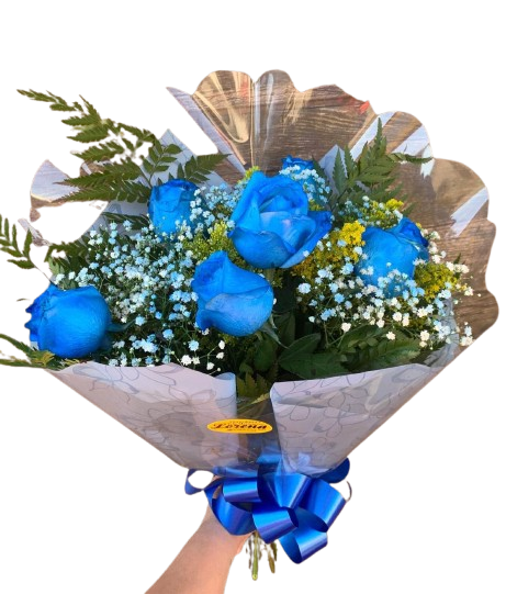 Um lindo Buquê composto por 06 rosas tingidas de azul , composto por folhagens , tango e gipsofila, em embalagem transparente, sujinho e laço de fita.