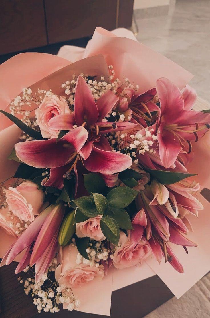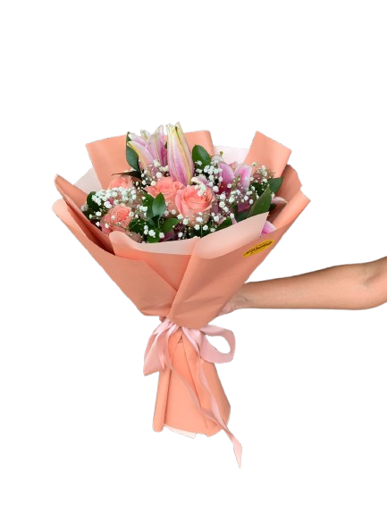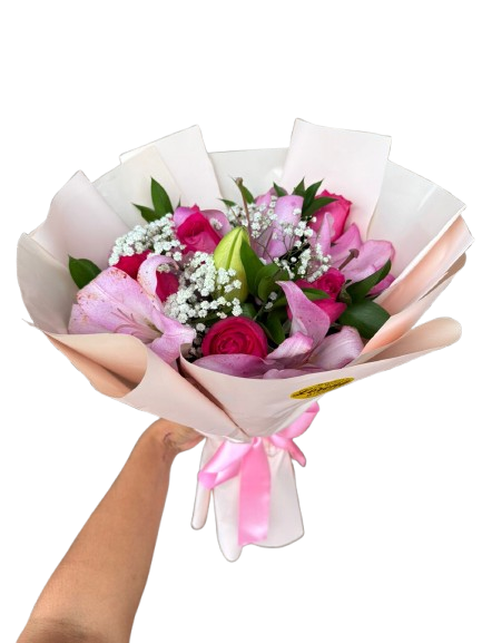 Um lindo Buquê composto por 04 Lírios, 6 Rosas, Rusgus e Gipsofila, embalado e finalizado em laço de cetim.