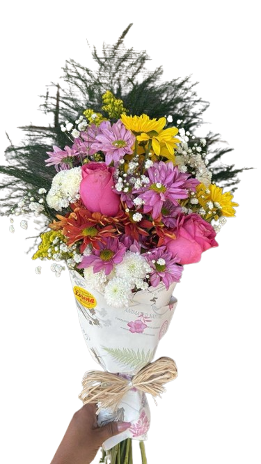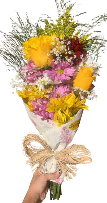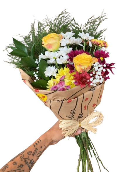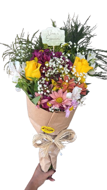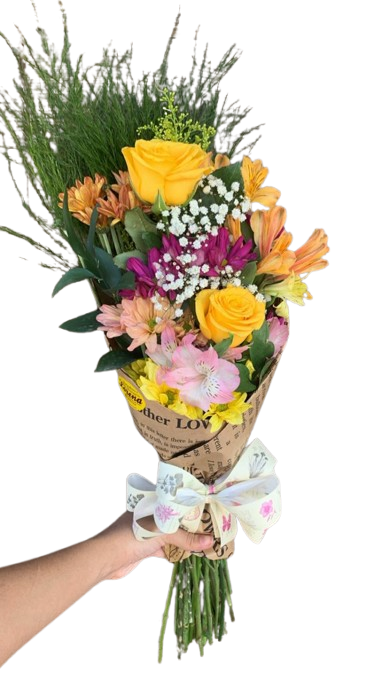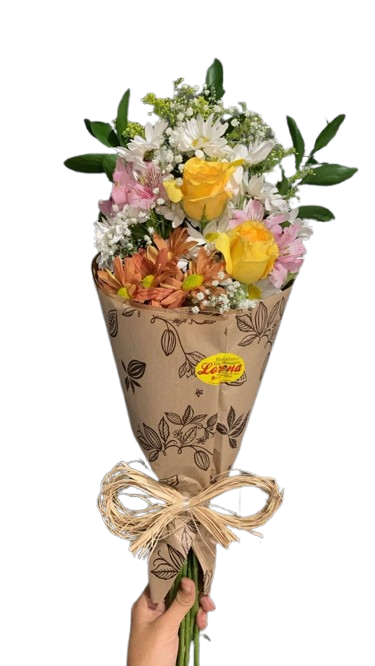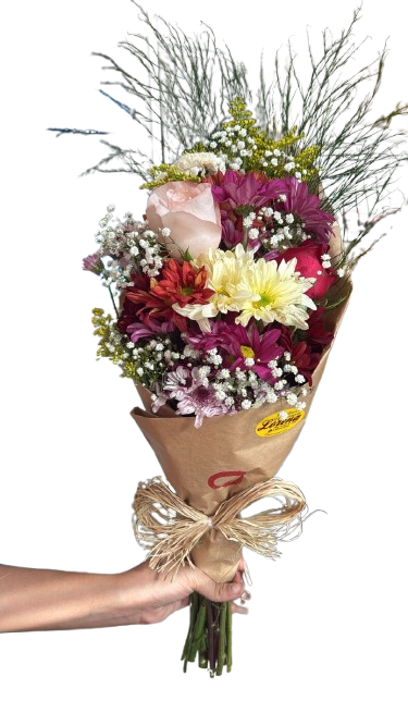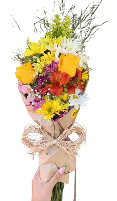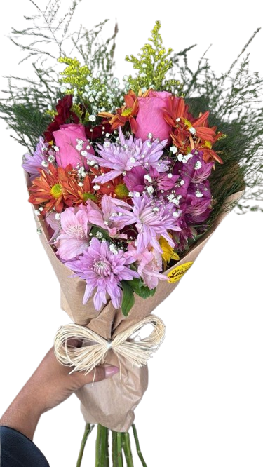 Lindo Buquê de flores mistas, mediano, composto por 02 rosas principais, a sua escolha, astromélias, margaridas , ruscus, astromélias, tango e gipsofila, finalizado em papel kraft e laço de ráfia.