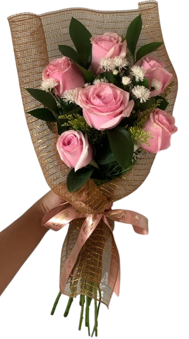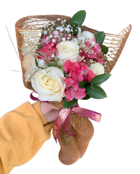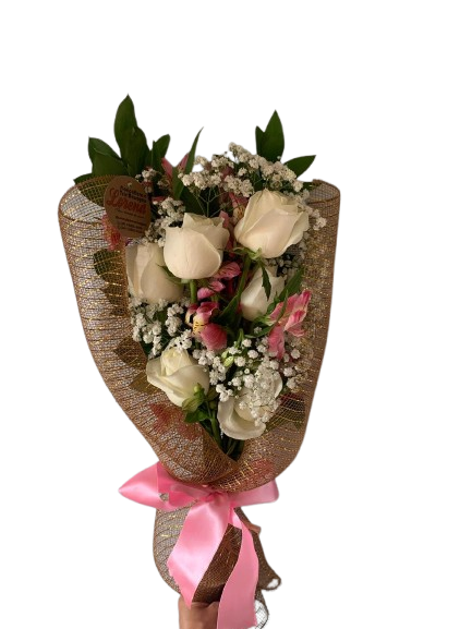Composto por 6 rosas brancas e astromélias rosas, ruscus e gipsofila, acabamento com laço de fita de cetim.