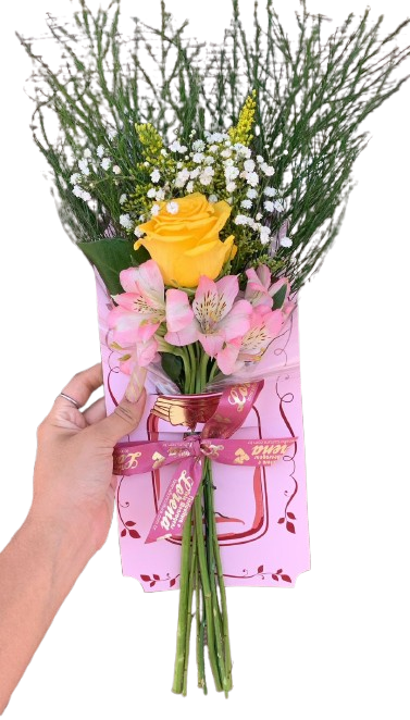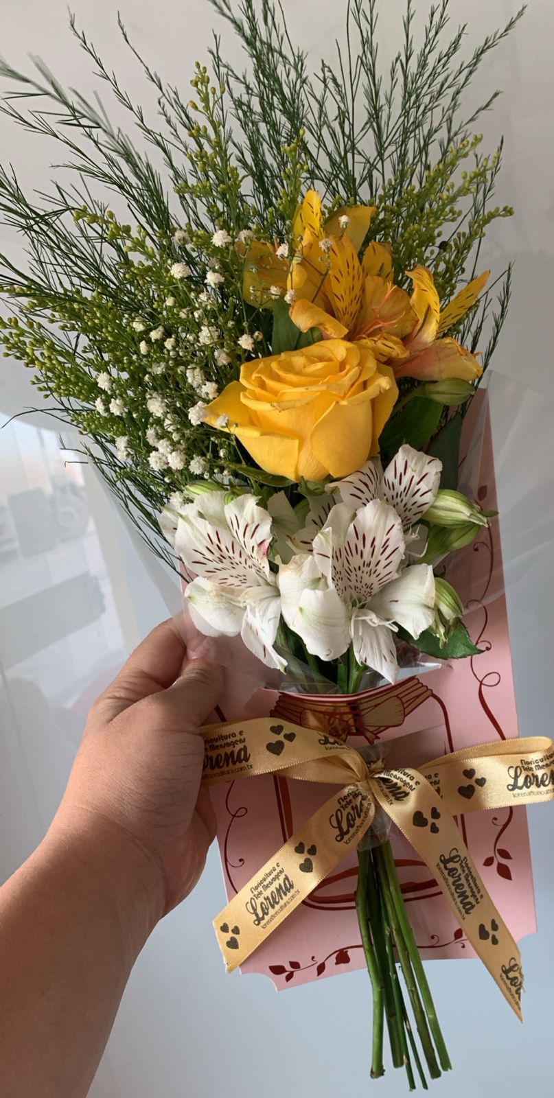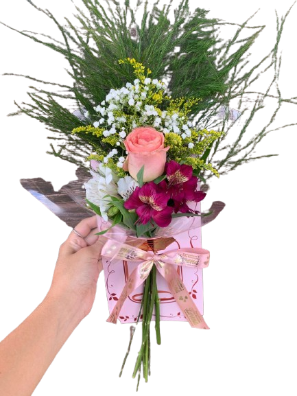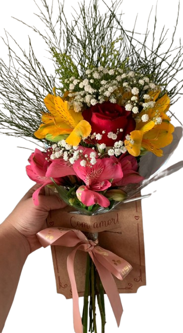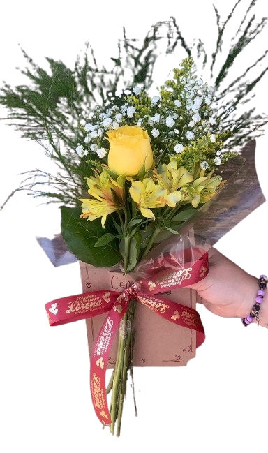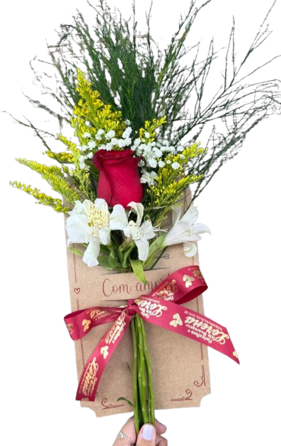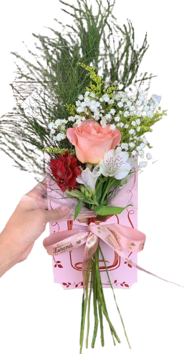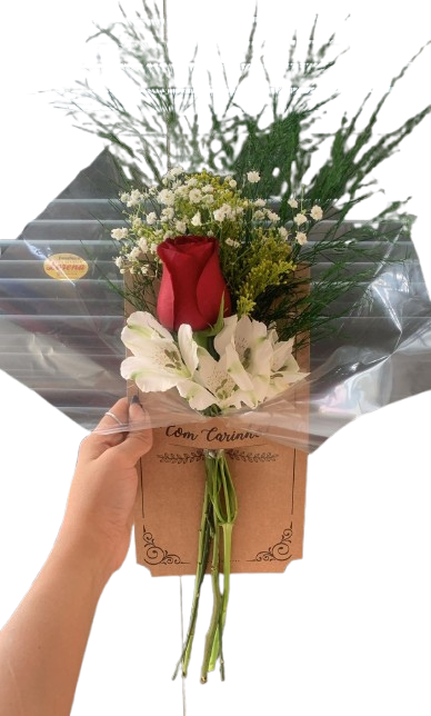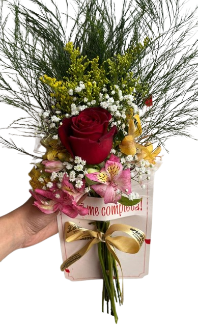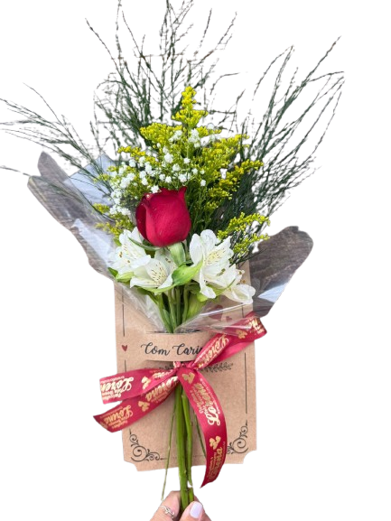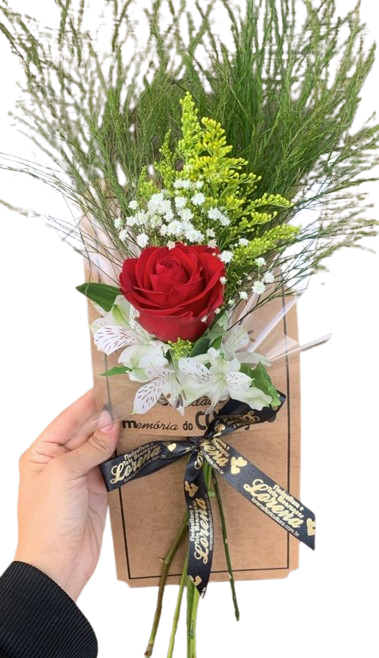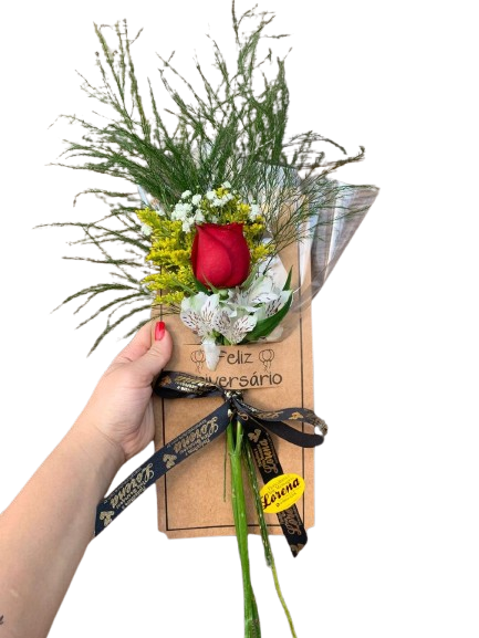 Composto por 01 Rosa , e Complementos como Astromélias, Tango e Folhagens.