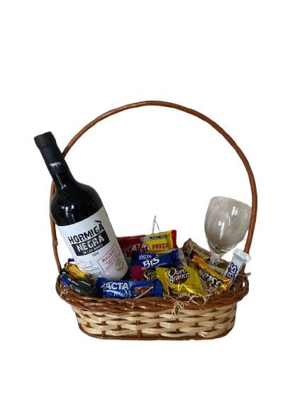 Cesta em vime, contém uma taça, um vinho, um KitKat e uma caixa de bombons variados. * Pode haver variação na marca do vinho.