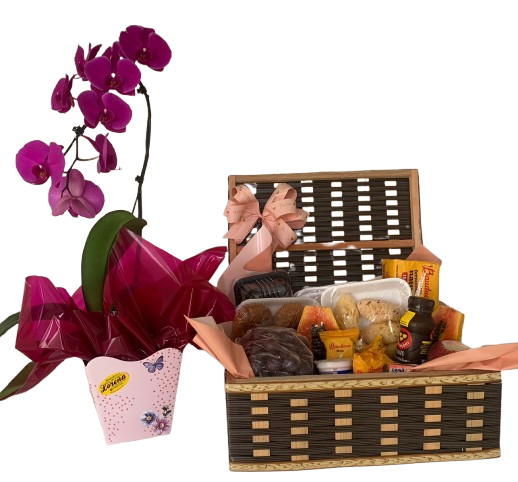 Baú contendo 1 bandeja de pão de queijo, 1 bandeja de broa, 1 bandeja de bolo, 1 bandeja de presunto, 1 bandeja mussarela, biscoitinho doce, biscoito salgado, rosca, 1 Toddynho, 1 suco, Cappuccino, 1 danone, 1 torrada, 1 vitamina, 3 bolinhos Bauducco, uva, mamão, maçã e 1 Orquídea a escolher.