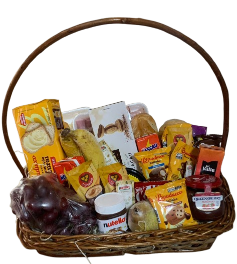 Contém 3 tipos de pães, 1 torrada Bauducco, 2 sachês de café Cappuccino, 3 sachês de chá, 3 bolachas de sal, 2 pão de mel, 2 sucos, 2 Toddynhos, 2 bolinhos Bauducco, 3 sachês de açúcar, 1 Nutella, 1 geléia Queensberry, 1 manteiga, 1 caixa Amandita, 1 café solúvel 50gr, 1 bandeja com peito de peru, 1 bandeja de mussarela, 1 bandeja de presunto, 1 chocolate M&M, 1 Kit Kat, 2 bananas, uva e 1 pêra.