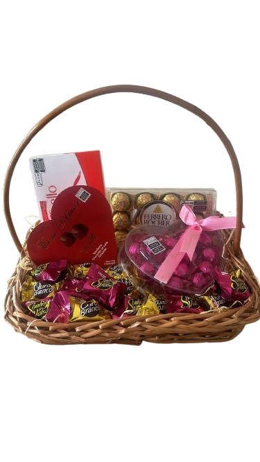Uma linda Cesta em Vime, composta por 01 Ferrero Rocher 12 unidades, 01 Raffaello 90 gr, 01 Coração com amor Viermon, 05 unidades, 01 Coração de bombons 14 unidades Viermon, e 07 Bombons Sonho de Valsa e 07 Bombons Ouro Branco, embalada em saco celofane, finalizado com laço de fita!