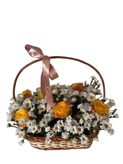 ‘Cesta composta por margaridas , e 06 rosas amarelas.