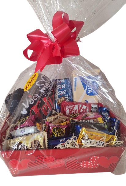 Contém 1 coração de pelúcia P de bracinhos, 1 caixa de Bis, 1 barra de chocolate, 1 Kit Kat e bombons variados, em uma linda caixa papelão vermelha, com corações.