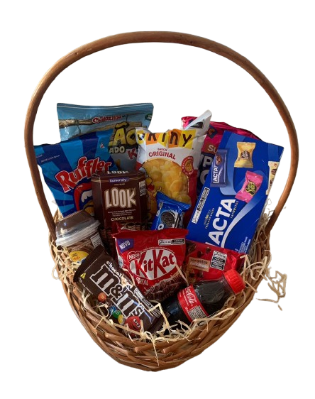 Cesta vime, composta por um Skini, uma Batata Rufles, um Pipocão doce , um Gulão, um MeMs