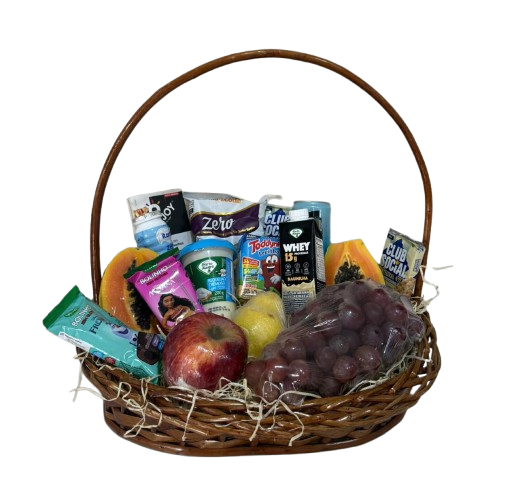 Composta por uva, mamão, pêra, maçã, suco diet, danone zero, 3 bolinhos diet, requeijão diet, vitamina diet, achocolatada zero, cookies integral, bolacha integral, caixa de barras de cereais e torrada integral.