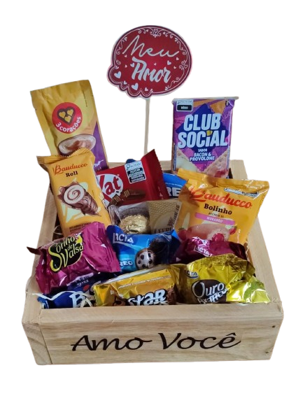 Linda cesta montada no platter. Contém: 01 KitKat, 01 Ferrero com 03 Unidades, 01 Bolacha Club Social, 01 Bolacha Oreo, 02 Bolinhos Bauducco, 01 Sache Três Corações e Bombons variados. Embalada e finalizada com laço de fita.