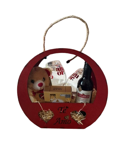 Cesta em MDF, contém uma pelúcia de aproximadamente 12cm, duas taças de vinho, uma caixa de Ferrero Rocher com 04 unidades.