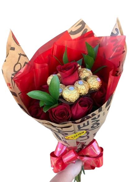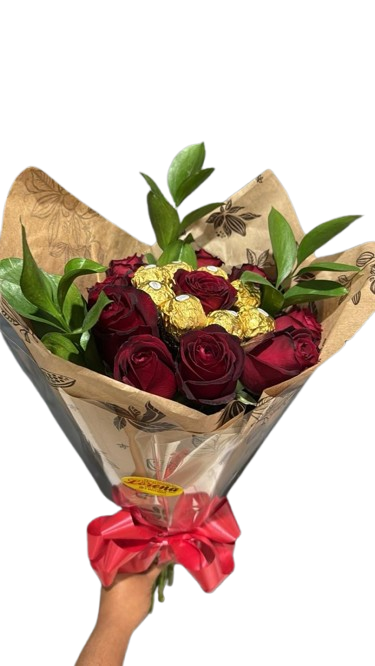 Lindo Buquê de10 Rosas Vermelhas e 08 Bombons Ferrero Rocher, embalado em papel krafte finalizado com laço de fita. Essa combinação é simplesmente perfeita para agradar quem você ama!!!