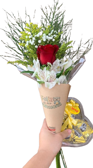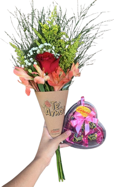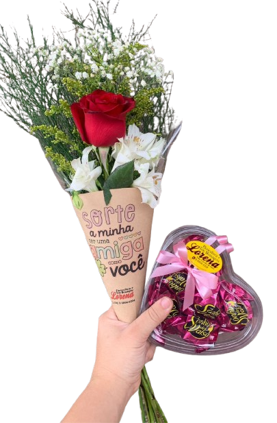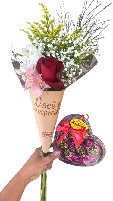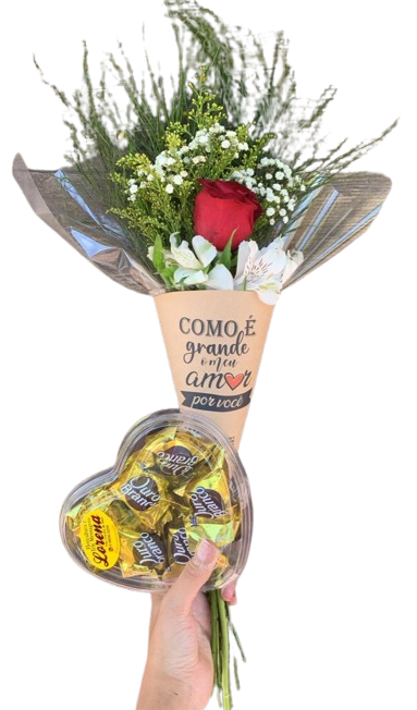 Cone flor, com frase , composto por 01 Rosa, Astromélias, aspargos, tango e gipsofila,acompanhada de um coração plástico, de sonho de valsa, ou ouro branco, 06 unidades