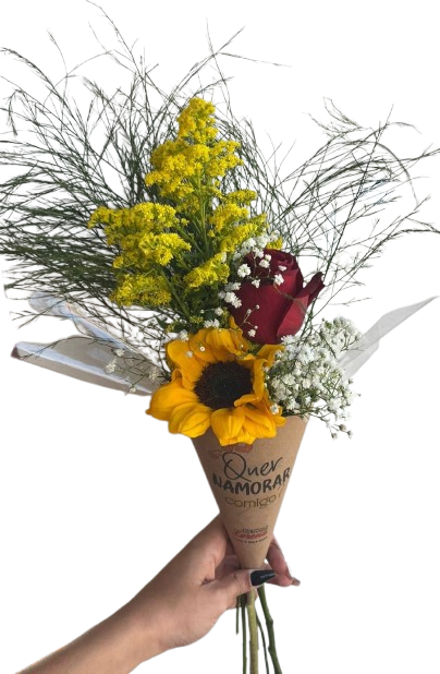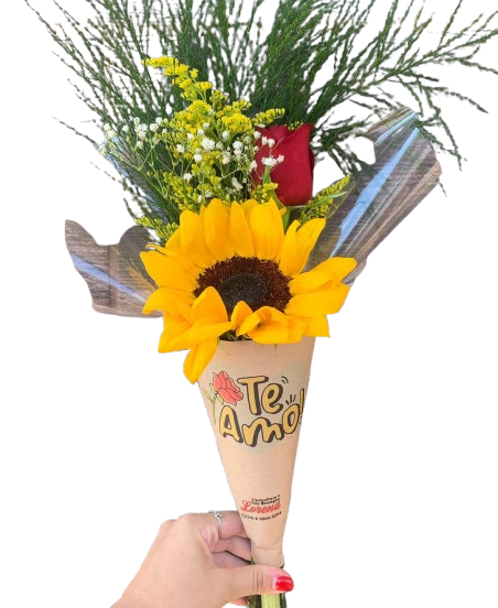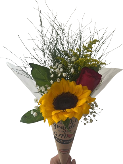 Cone Flor com frases(frases disponível no estoque), composto por uma rosa (cor disponível no estoque) , Girrasol, tango , gipsofila, e aspargos.