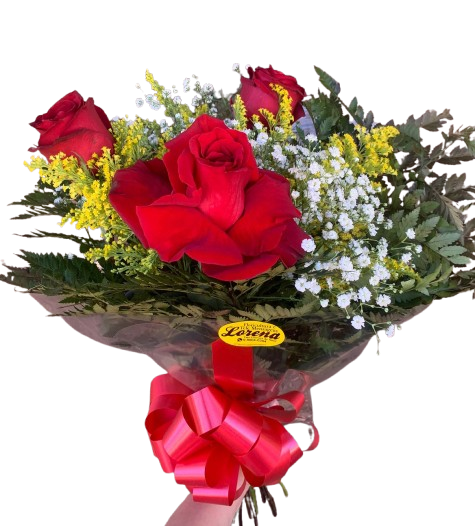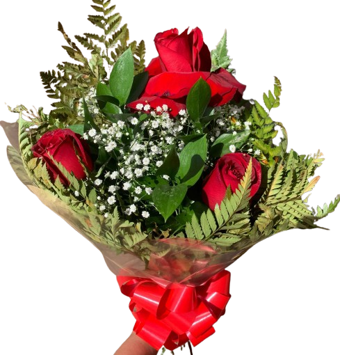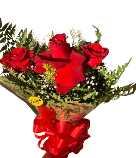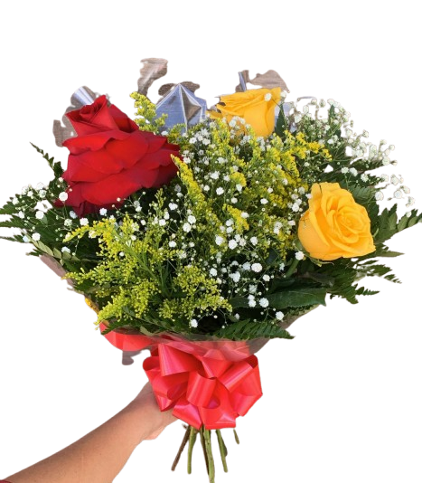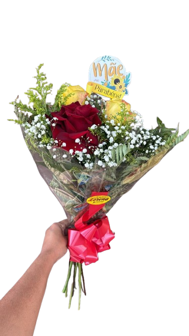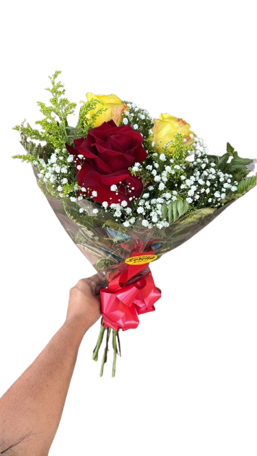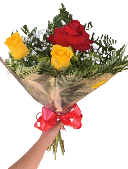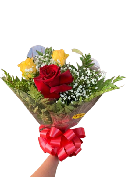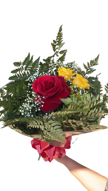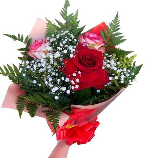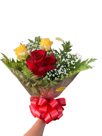 Um lindo Mini Buquê composto por 02 rosas nacionais cor a sua escolha e 01 rosa colombiana vermelha, folhagens , tango e gipsofila, embalado em leque transparente, finalizado com laço de fita!
