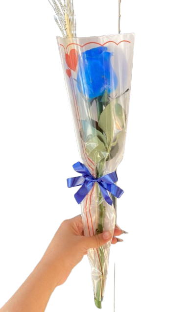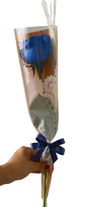 Linda Rosa azul decorada com trigo, laço de rafia e embalagem transparente…
