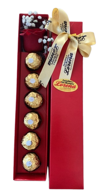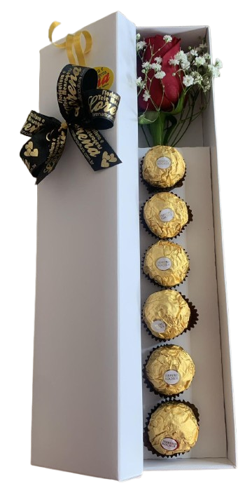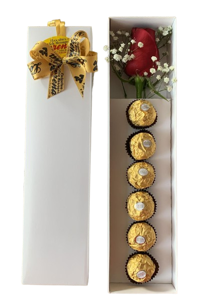 Caixa Papelão personalizada, composta por 01 linda rosa, gipsofila, e 06 unidades de Ferrero Rocher!
