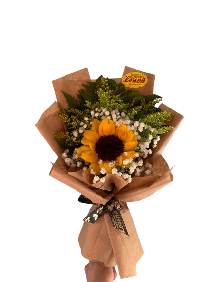Girassol com embalagem em kraft e laço de cetim, composto por Tango, gipsofila e folhagens. Um mimo, simples e lindo!